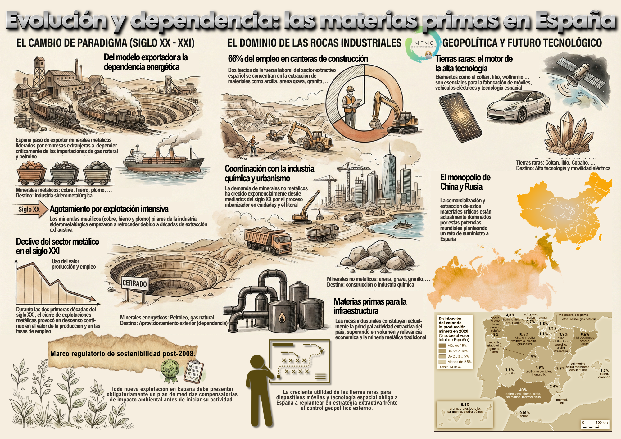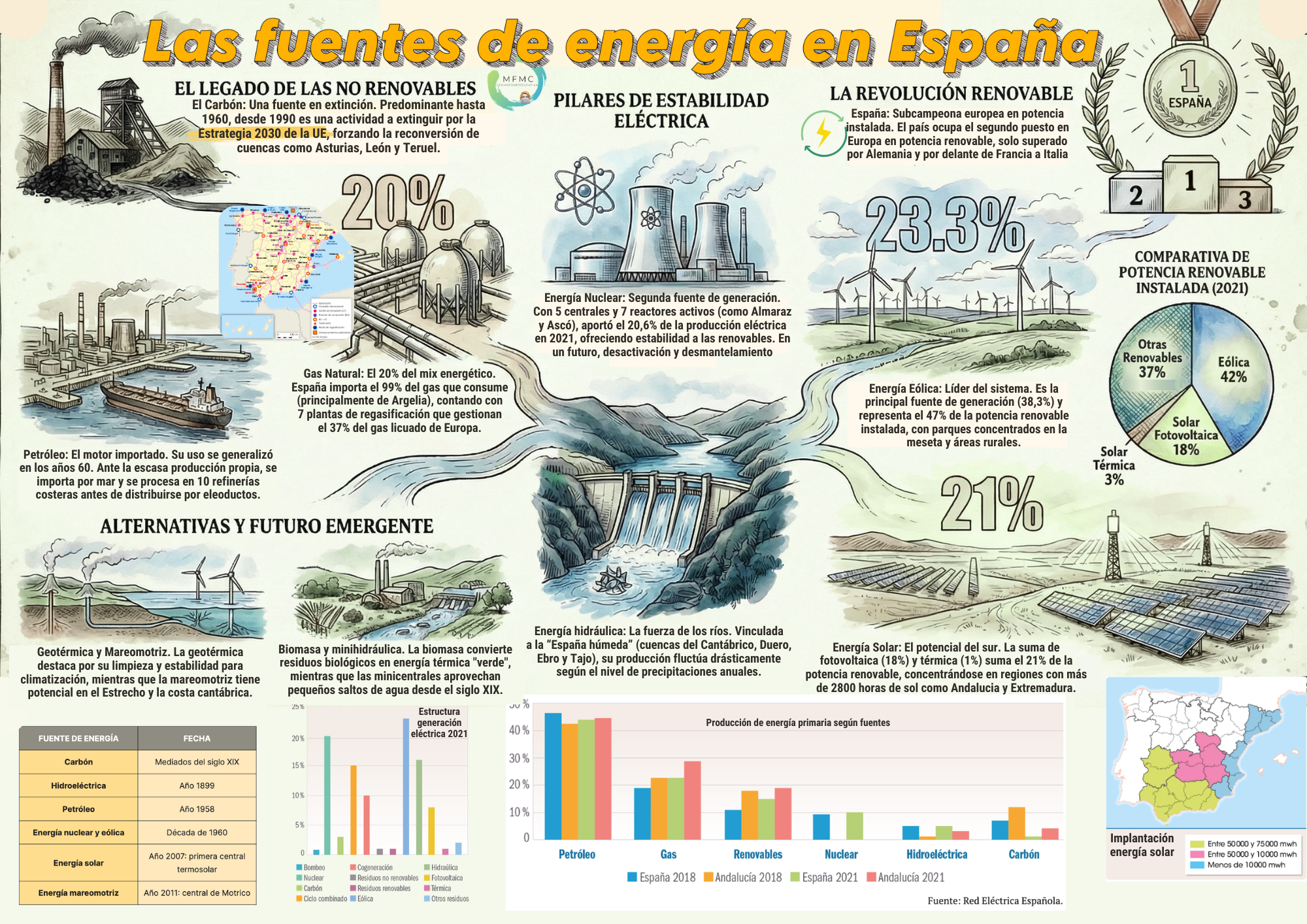 La energía es la fuerza que se transforma en trabajo mecánico. Las materias minerales que se convierten en energía son las fuentes de energía que se clasifican en :renovables, su uso no compromete su existencia, no renovables,, su uso conlleva su desaparición. Según su potencialidad, las clasificamos en primarias, las que contienen energía que no puede usarse directamente, sino que es desprendida cuando se transforma (carbón, petróleo, gas, uranio,...) y secundarias que se manifiesta en forma de luz, calor, electricidad,...y procede de la transformación de la primaria.
