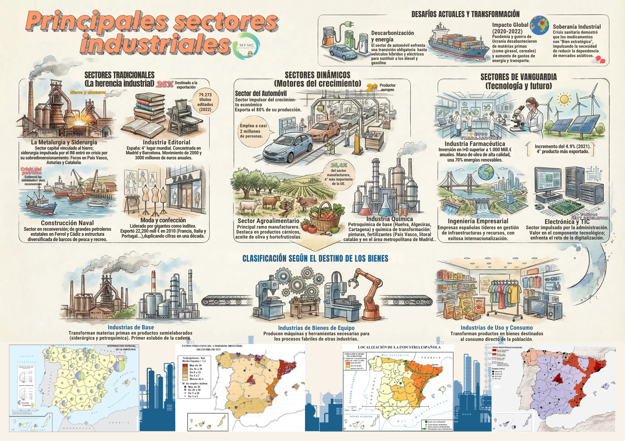 b) Otros sectores industriales, como los de automoción, químico y agroalimentario, presentan un mayor dinamismo, que procede de su condición de abastecedores de bienes y productos absolutamente imprescindibles en el funcionamiento de la propia sociedad industrial. Por lo general, son actividades con un alto componente tecnológico, tributarias de grandes inversiones y capital multinacional, y de grandes instalaciones fabriles.