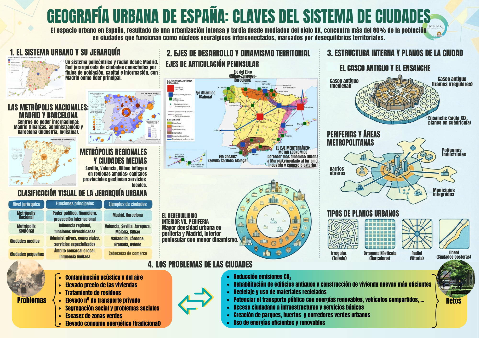 El sistema urbano español está constituido por un conjunto de ciudades interrelacionadas. Por tanto, se compone de unos elementos, las ciuda des; y de las relaciones que establecen entre sí.