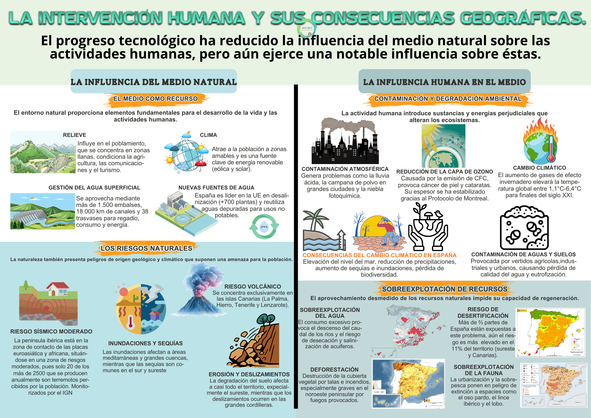 Aunque el progreso tecnológico reduce la influencia del medio natural sobre las actividades humanas, este todavía ejerce una notable influencia sobre éstas. No podemos olvidar que es, al mismo tiempo, un factor positivo puesto que aporta recursos para el ser humano, y negativo, por los riesgos naturales que representa.