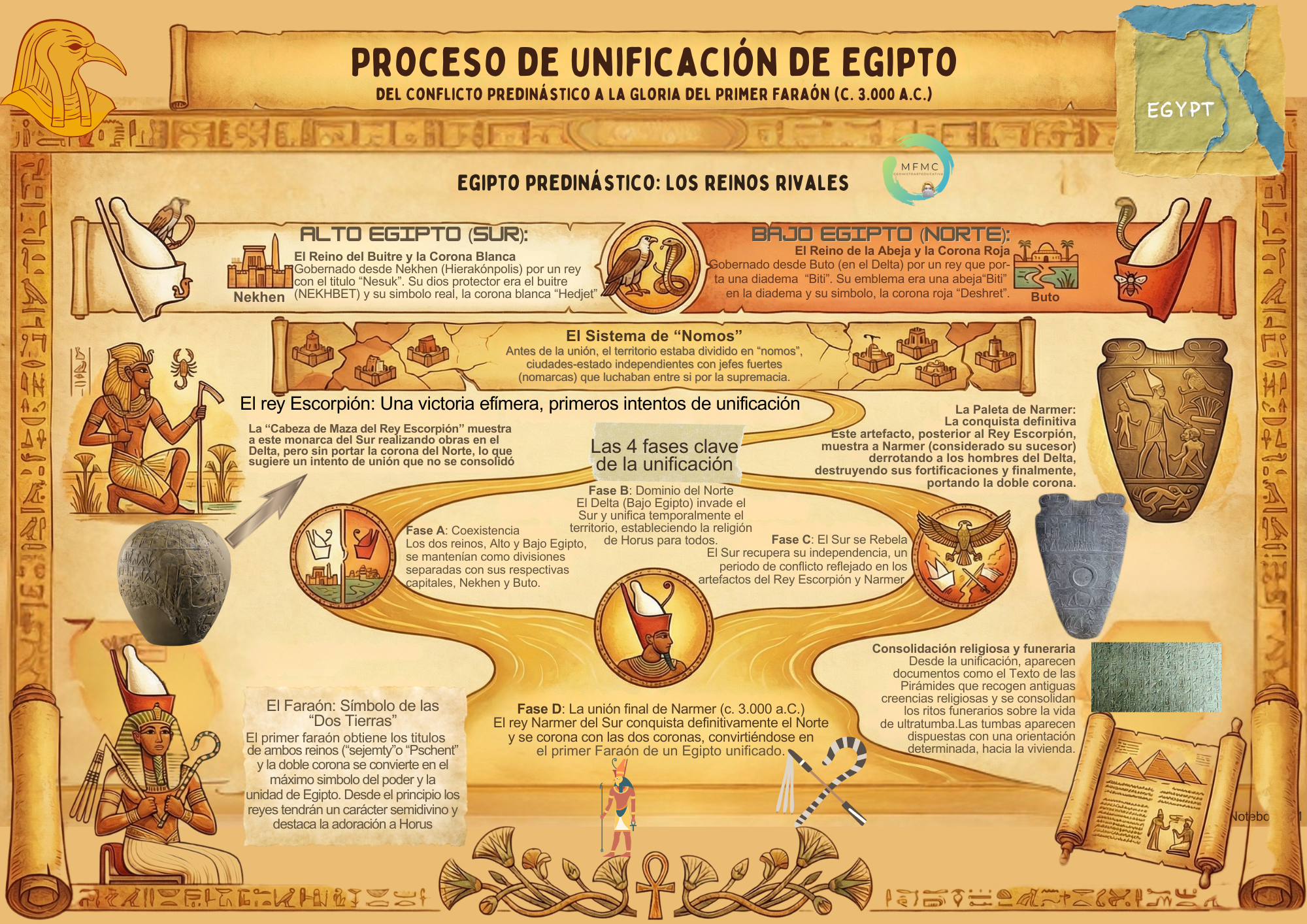 c) El sur se independiza, paletas de Narmer y la Maza de Escorpión;